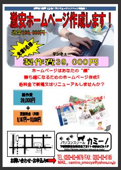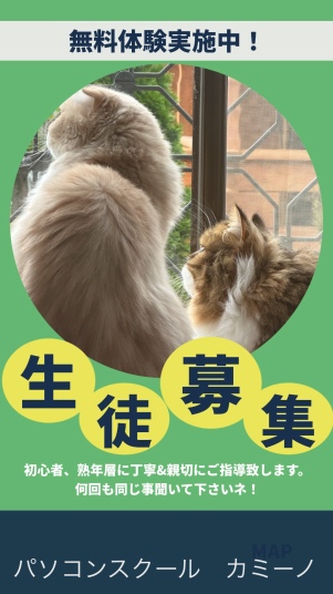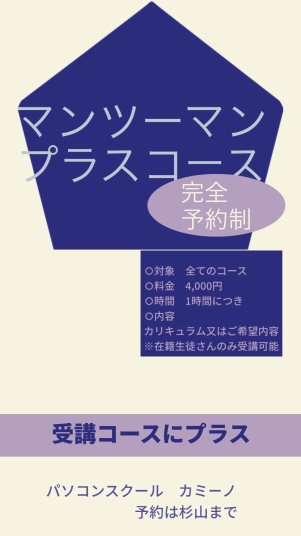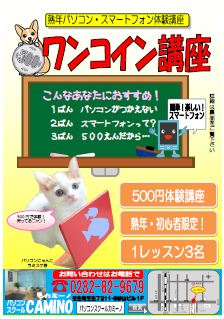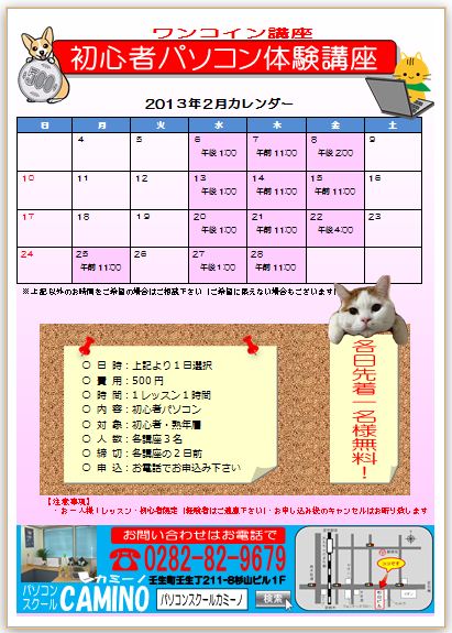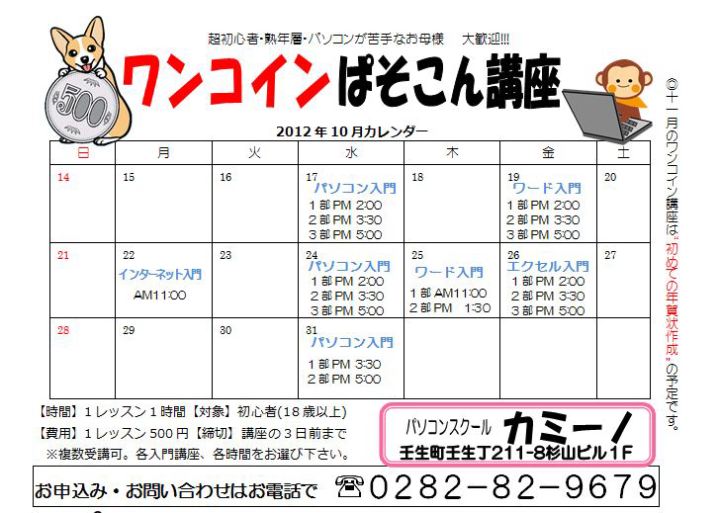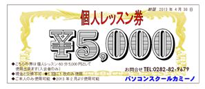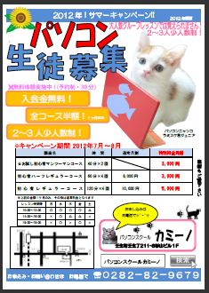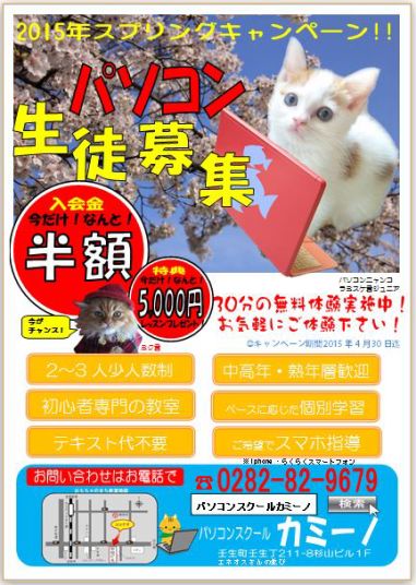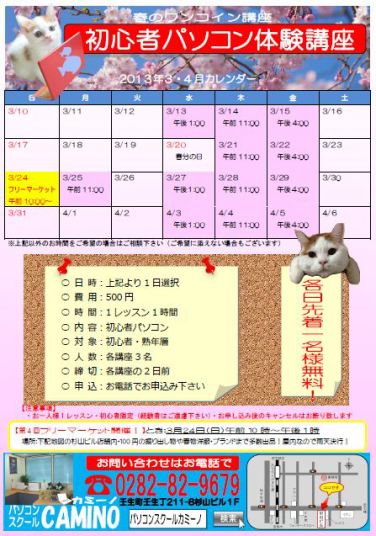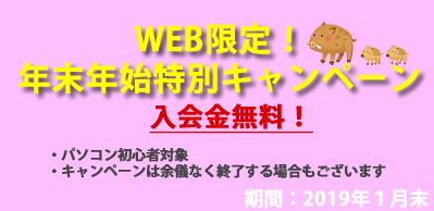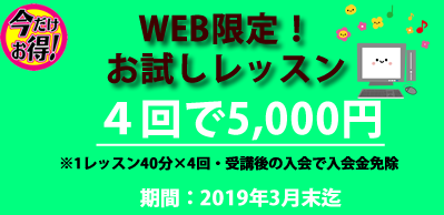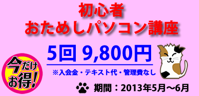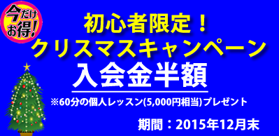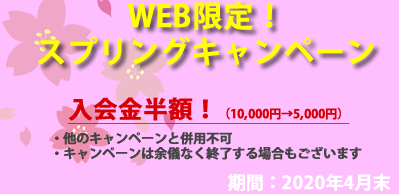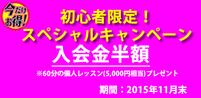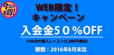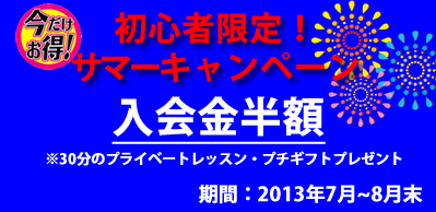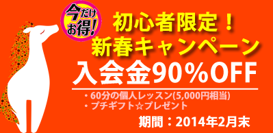 2012.03.01 スプリングキャンペーン! 入会金半額+60分のレッスン付&プチプレゼント!終了致しました (4月末まで) 2012.02.01 お得なチケット制スタート!チケット5,000円分プレゼント! (プレゼントは終了致しました) 2012.01.25 無料講座(60分個人レッスン)終了致しました レッスン料金半額キャンペーン終了致しました 2012.01.01 入会金無料(2012年2月末まで)終了致しました 体験レッスン実施中!